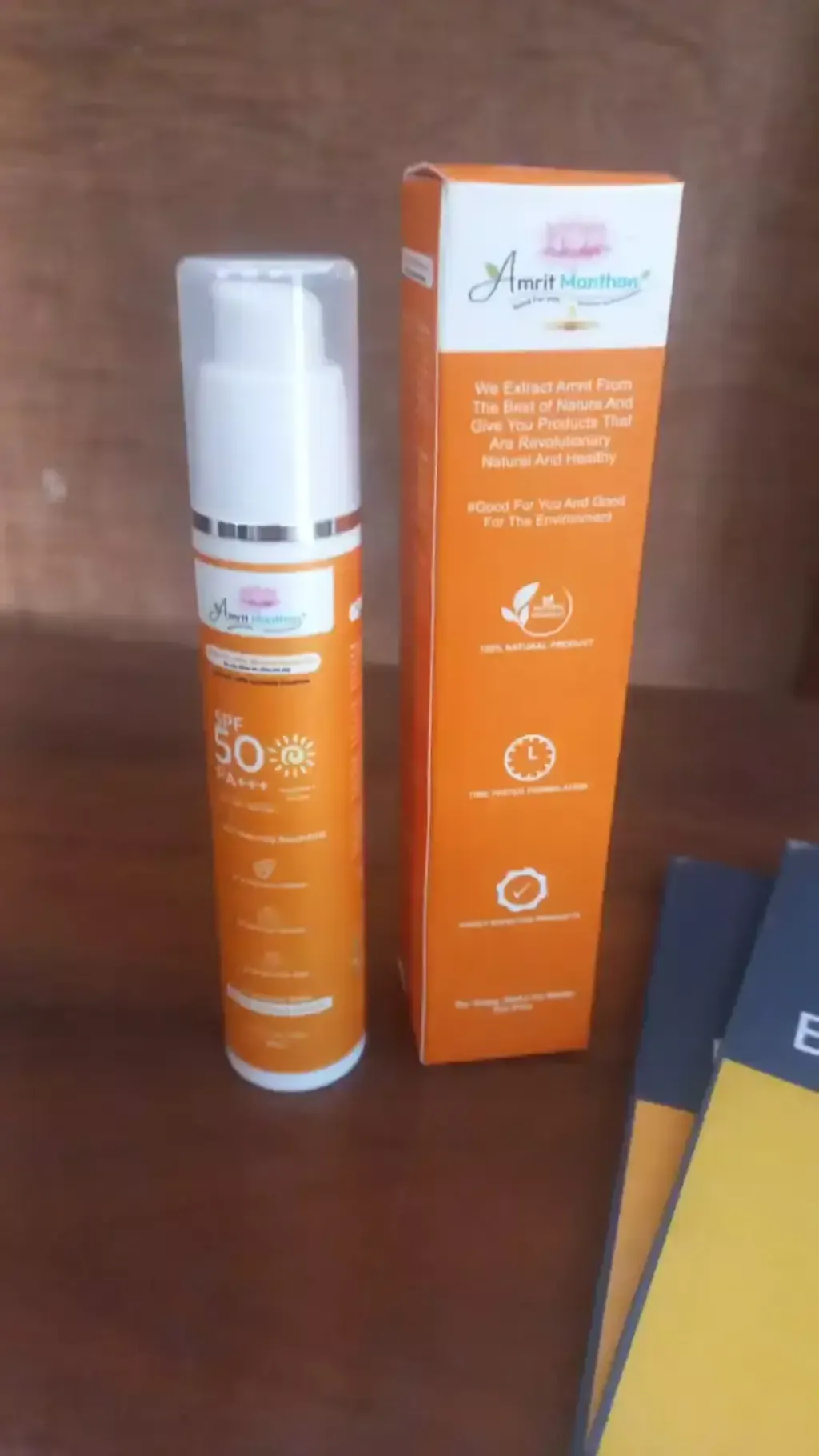 amritmanthan sunscreen Lightweight texture absorbs fast with zero white cast, leaving skin glowing & nourished by Ayurvedic ingredients like aloe, vitaminc and bioretinol. Offers strong UV, pollution & blue-light protection, feels non-greasy and irritation-free even on sensitive skin.